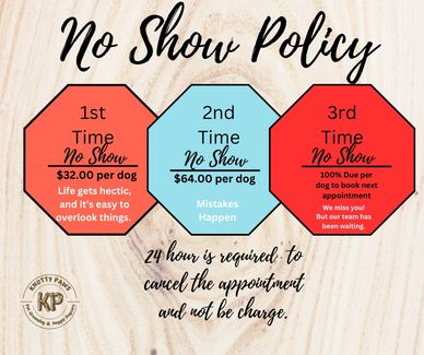 No-shows/Cancellations: Please give us at least a 24-hour notice if you cannot make it to your appointment. The first time you are a no call/no show we will add a $3200 charge per dog to your next grooming appointment. After you No-Show us 2 times there will be a $64.00 Fee per dog charged to your card on file, will be required to prepay in full for all your future appointments.